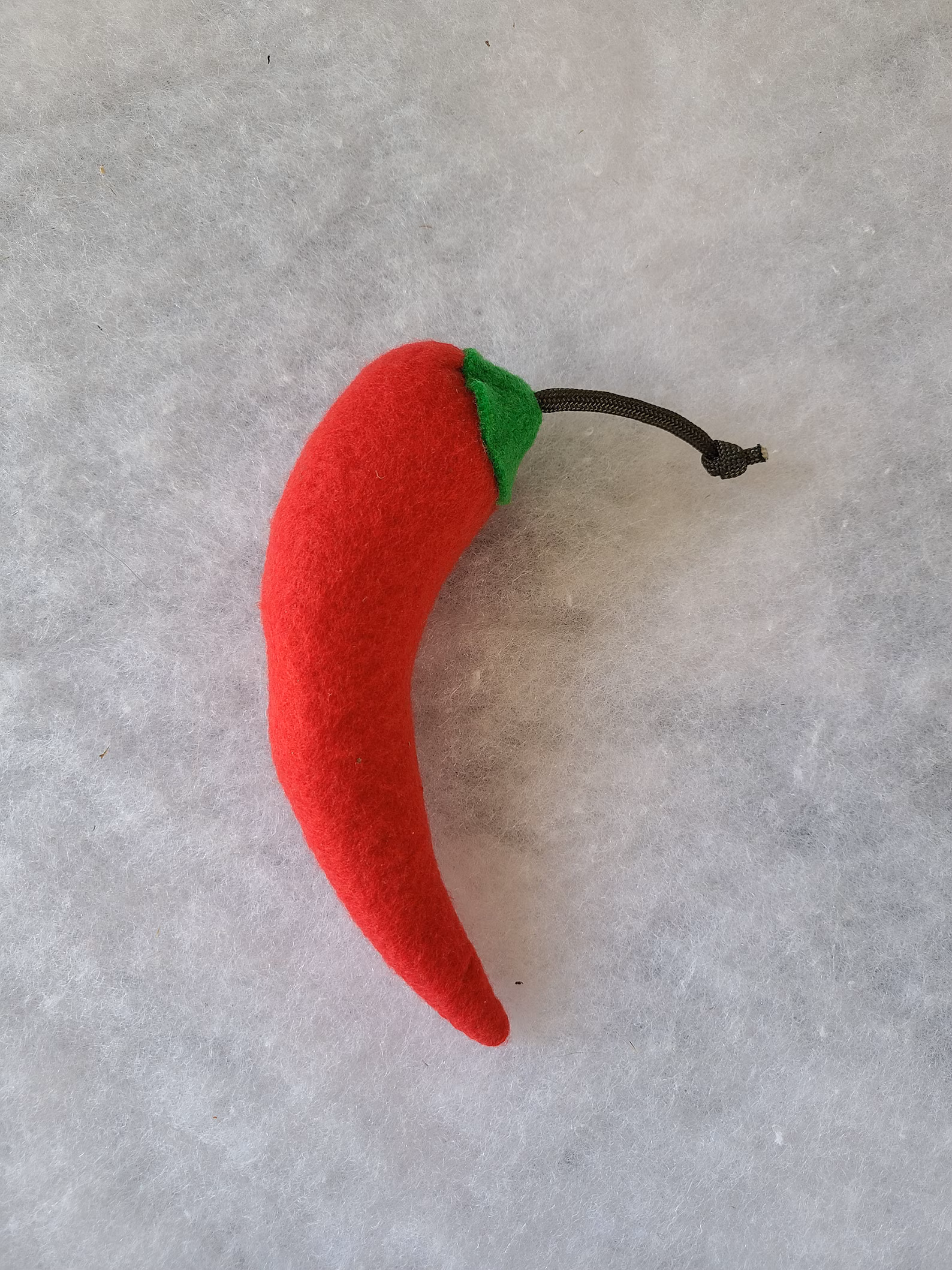 Zabawka – kopacz dla kota w kształcie papryczkii, wypełnionej dobrej jakości kocimiętką z Kanady. Wykonana ręcznie, każda zabawka jest unikalna.