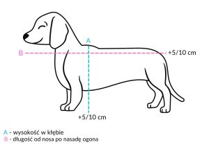 KROK 2. Zmierz swojego psa według rysunku (długość od noska do nasady ogona oraz wysokość w kłębie, czyli od podłogi do najwyższego punktu na kręgosłupie). Wymiary zapisz na kartce. Nagródź psiaka 😉