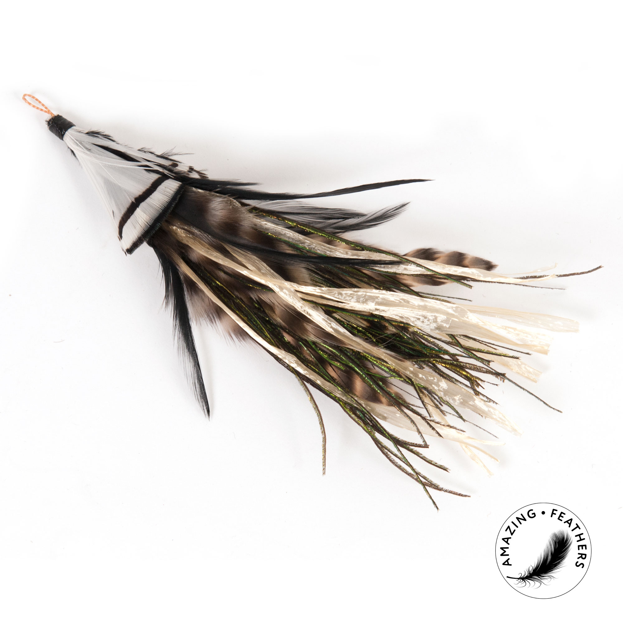 Kolorowa zawieszka do wędki dla kota w kształcie żaby oraz ogona. Wykonana ręcznie z sierści jelenia, kolorowych piór. Każda zawieszka jest unikalna.