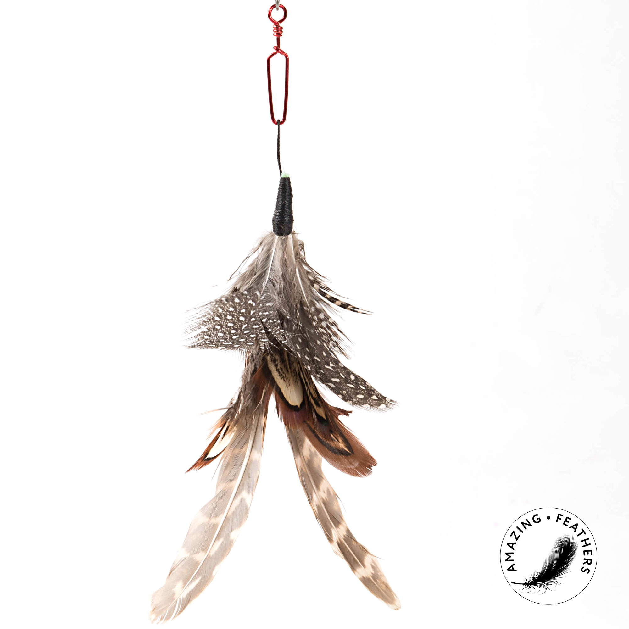 Linka z 2 karabińczykami jest przymocowana do wytrzymałego kija z drewna bukowego, nie płacze się, jest wyjątkowo wytrzymała na ścieranie . Umożliwia to prostą i szybką wymianę różnych zawieszek. Piórka doczepione do wędki Profeline są wykonane w 100% z naturalnych piór kurczaka.