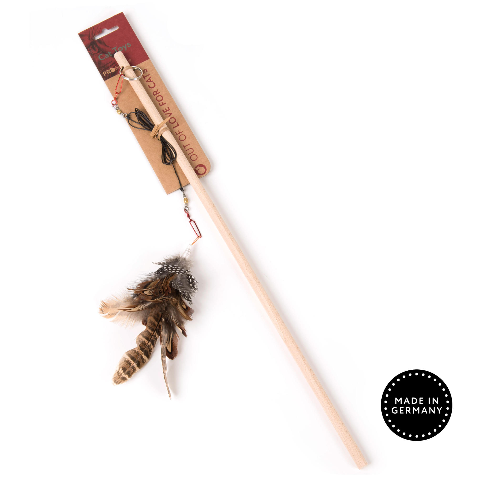 Drewniana wędka dla kota, wykonana z drewna bukowego, z karabińczykiem. Umożliwia doczepienie dowolnej zabawki dla kota, w zestawie z piórkami.