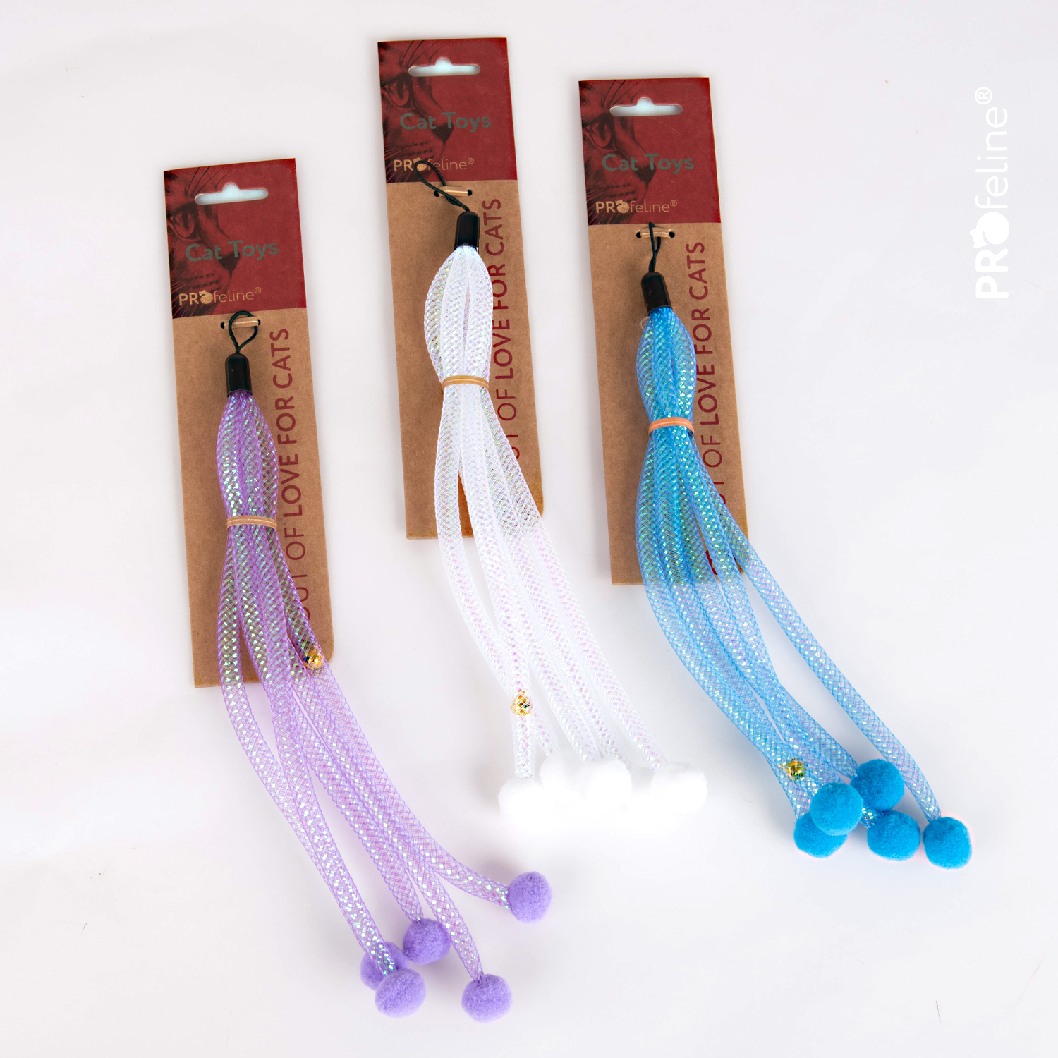 Zabawka dla kota w kształcie błyszczących rurek z delikatnym dzwoneczkiem. Wykonana ręcznie z syntetycznego materiału. Idealna do zabawy.