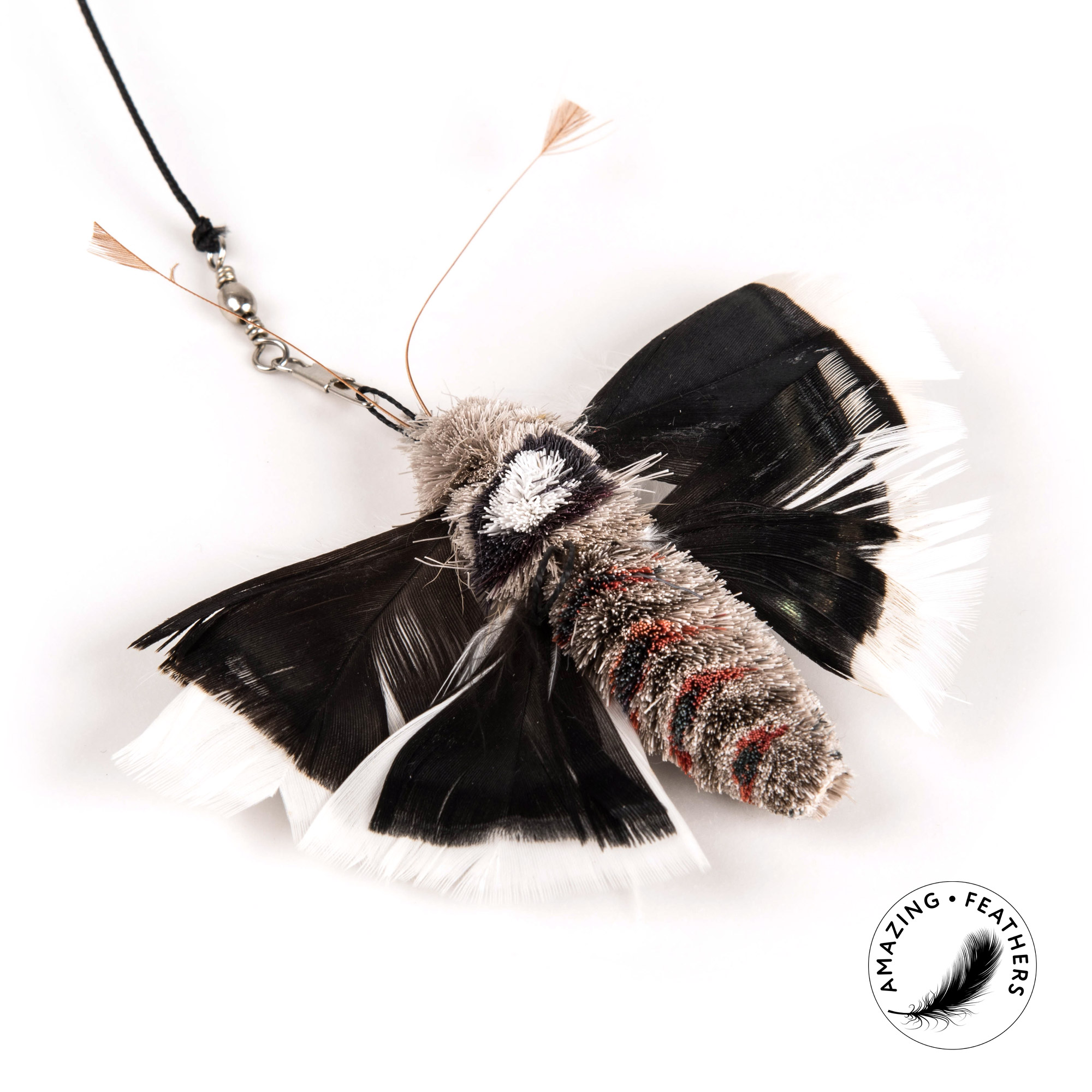 Ręcznie wykonana zawieszka boa z naturalnych, puszystych strusich piór przeplatanych czarno-białymi strusimi frędzlami. Jest doskonała zabawką dla kota.
